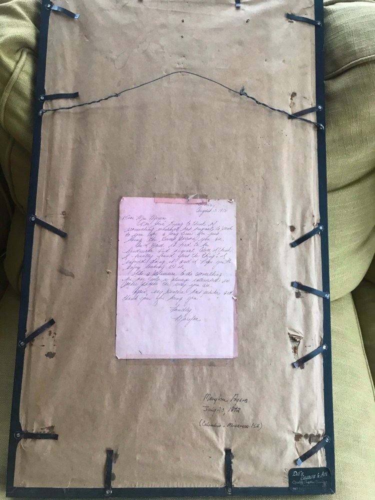 The framed cross-stitch and embroidery I collect from thrift stores and hang up all over my house isn’t just someone’s discarded ephemera that I happen to love the look of—it was crafted by a grandmother, a child or a mother—a pattern followed with precision and grace, given as a gift or as a very tangible imploration “Please never forget who I was or how much I loved you.” Some initialed. Others left anonymous as any mystery is, but professionally matted and framed by stores in New Haven or Boonton, New Jersey that went out of business fifty years prior. A floral piece in my living room has a pink note attached to it, dated August 13, 1972. It’s from a girl named Marylou and gifted to her (friend? Teacher? Neighbor?) Mrs. Meyers. How did I hang this picture without noticing the letter taped rather conspicuously to the back of it? Did I see the letter but just not bother to read it? Marylou wanted to do something special for Mrs. Meyers, something “unusual but original.” She thought about it long and hard before putting needle to fabric. The gift had to be handmade, because Mrs. Meyers was that special to Marylou.