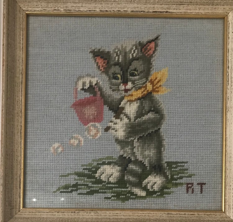 Another piece hangs above the French doors in my kitchen: a cat blowing bubbles. It was a Christmas gift from a great-grandmother to her “new” great-grand daughter. The year is once again, 1972. Already, she loves this baby girl, creates her something lasting and tagged with the initials of a forgotten old woman. As I begin my very first embroidery project (the simplest pattern I could find on Amazon), I think about finishing it and then being proud enough of my effort to get it framed, and prouder still to give it to a loved one. And then, fifty years later, there it is at Goodwill for $2.99. And no one is left alive to remember how very much one person loved another, how wholly love could endure in such stitches and seams.